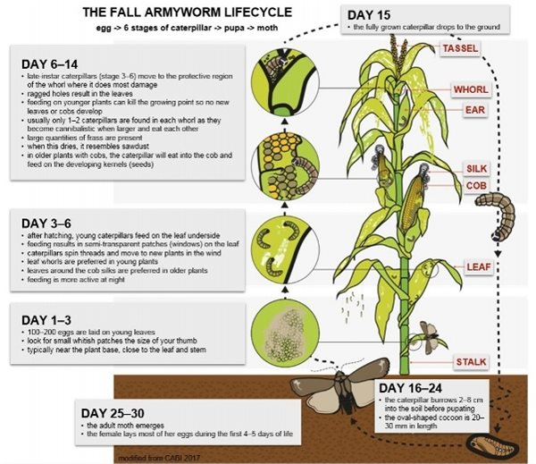 Vòng đời của sâu keo mùa thu trải qua sáu giai đoạn và chúng tấn công cây ngô suốt trong quá trình trưởng thành thành bướm đêm. Ảnh: Fao